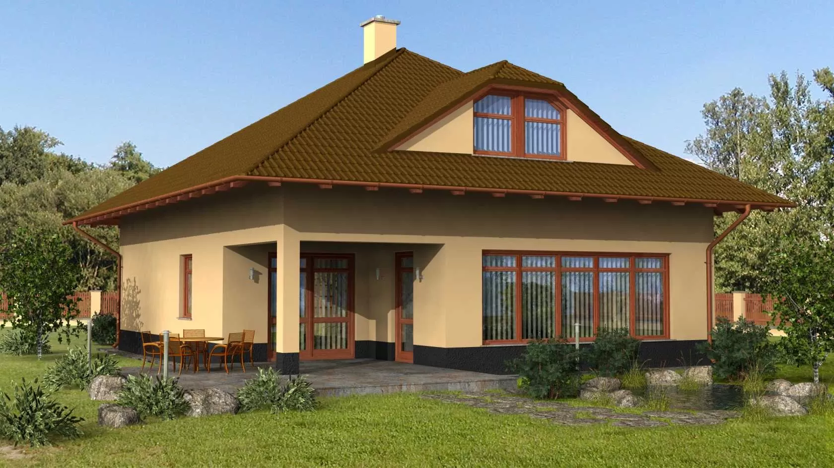 A není třeba se bát, že by se nízkoenergetický rodinný dům „okoukal“. Vždy bude zajímavou, oku lahodící stavbou, postavenou na jednoduchém půdorysu, se zastavěnou plochou 131,20 m2. Díky některým zajímavým exteriérovým prvkům jako je ze střechy vystupující nerezový komín či dva proti sobě ležící vikýře, bude dům doslova nepřehlédnutelným. Stejně tak je nestandardním prvkem v našich končinách i chybějící přední oplocení. Nízký kovový plot, včetně integrované vjezdové brány, prodlužuje čelní linie domu na obě strany až k bočnímu oplocení. Dům je prostě líbivý!